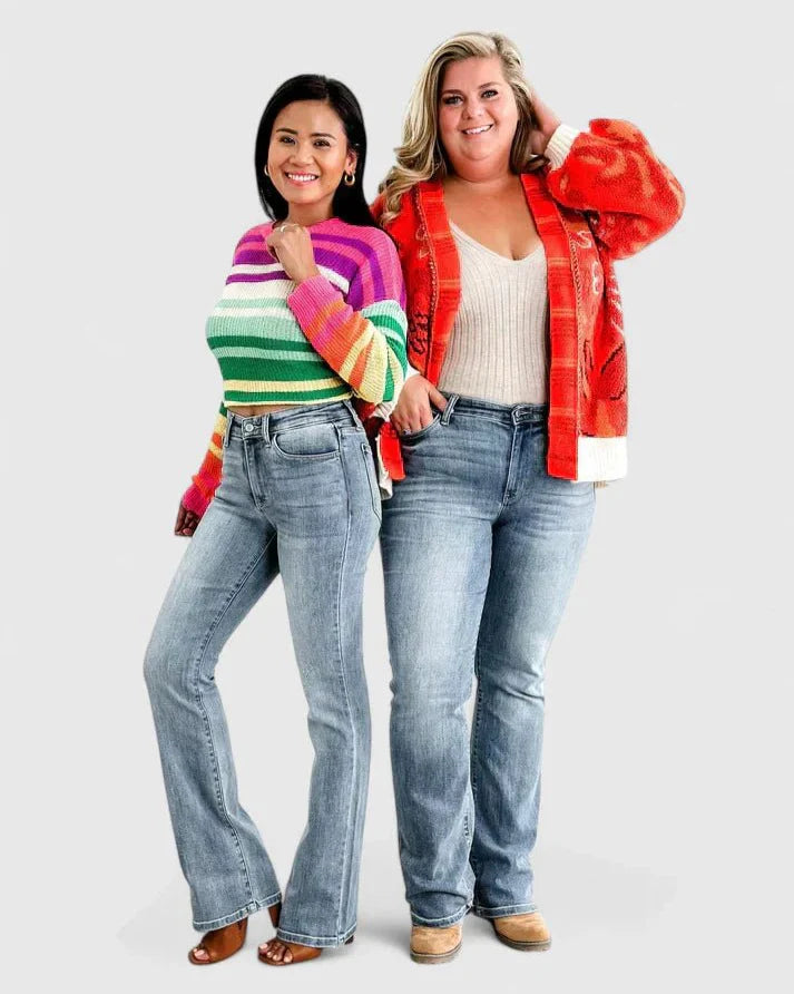 - Tidløs bootcut-snit der forlænger benene og balancerer proportionerne.