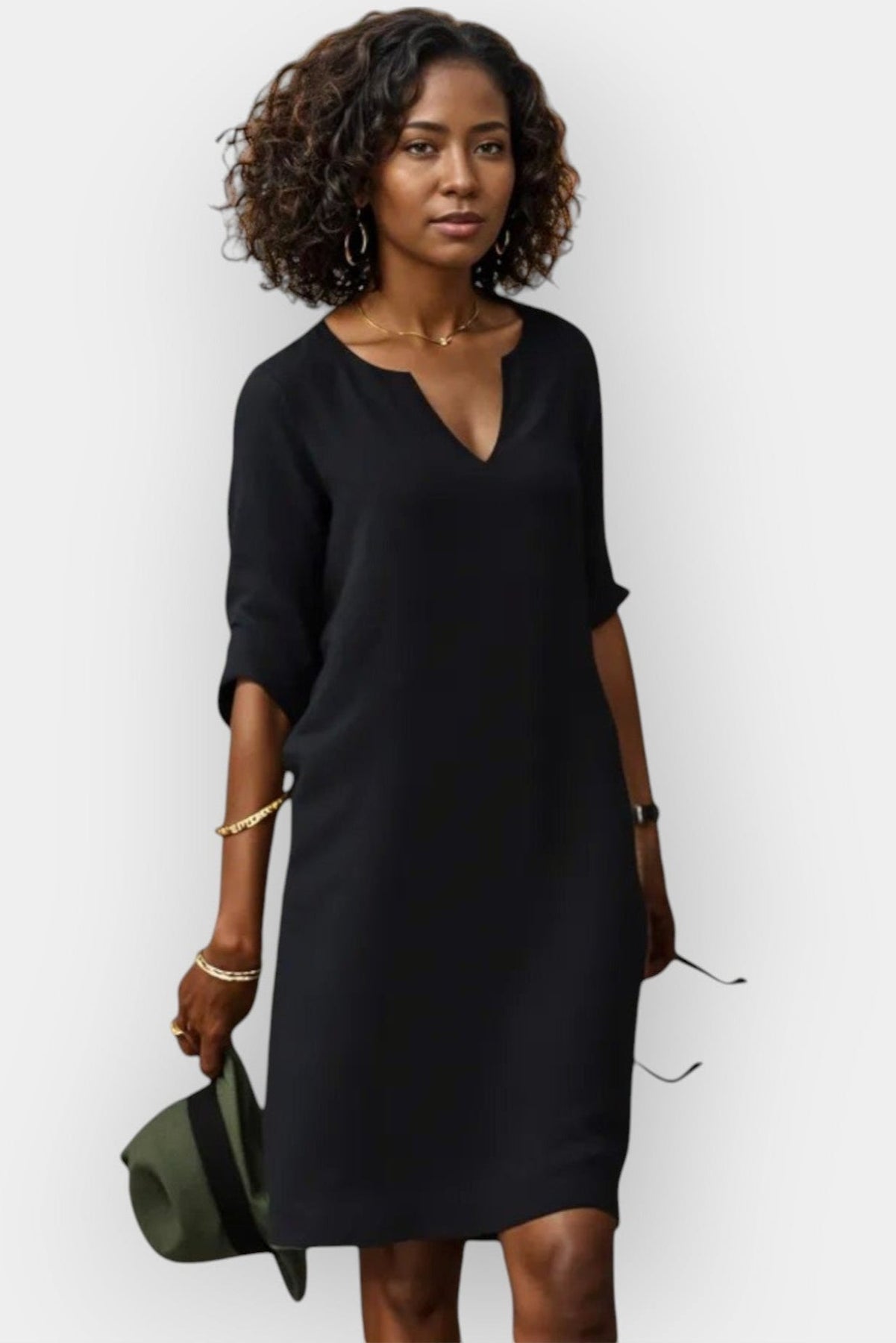 • Elegant snit og silhuet: taljen fremhæves subtilt, mens kjolen glider let over kroppen.
