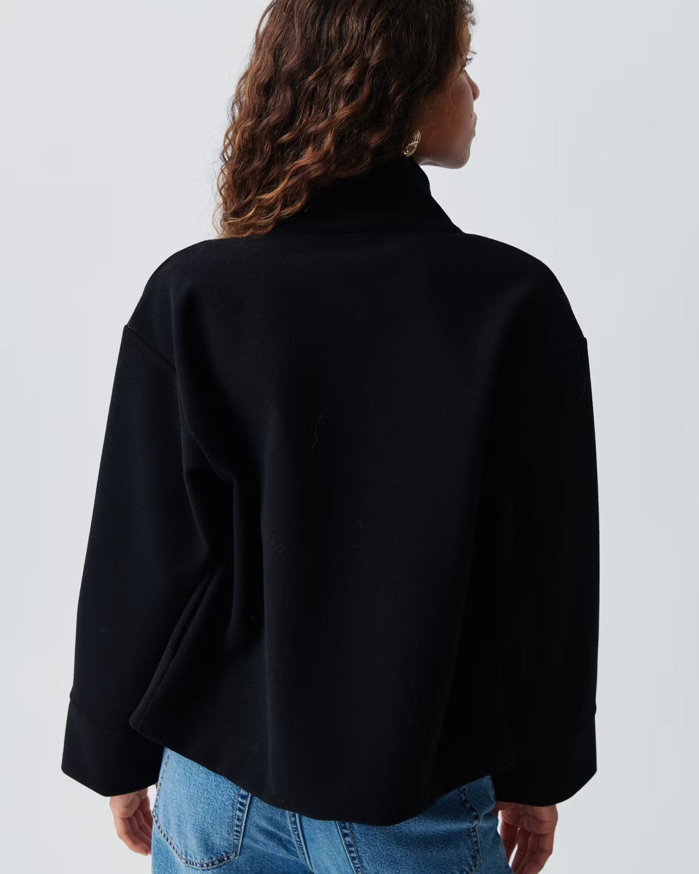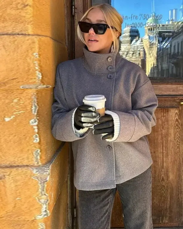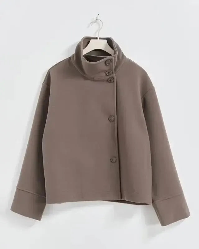 Kort snit smigrer de fleste kropstyper, mens den asymmetriske lukning og den store krave skaber en tidløs silhouette, der udstråler raffinement uden at gå på kompromis med bevægelsesfriheden.